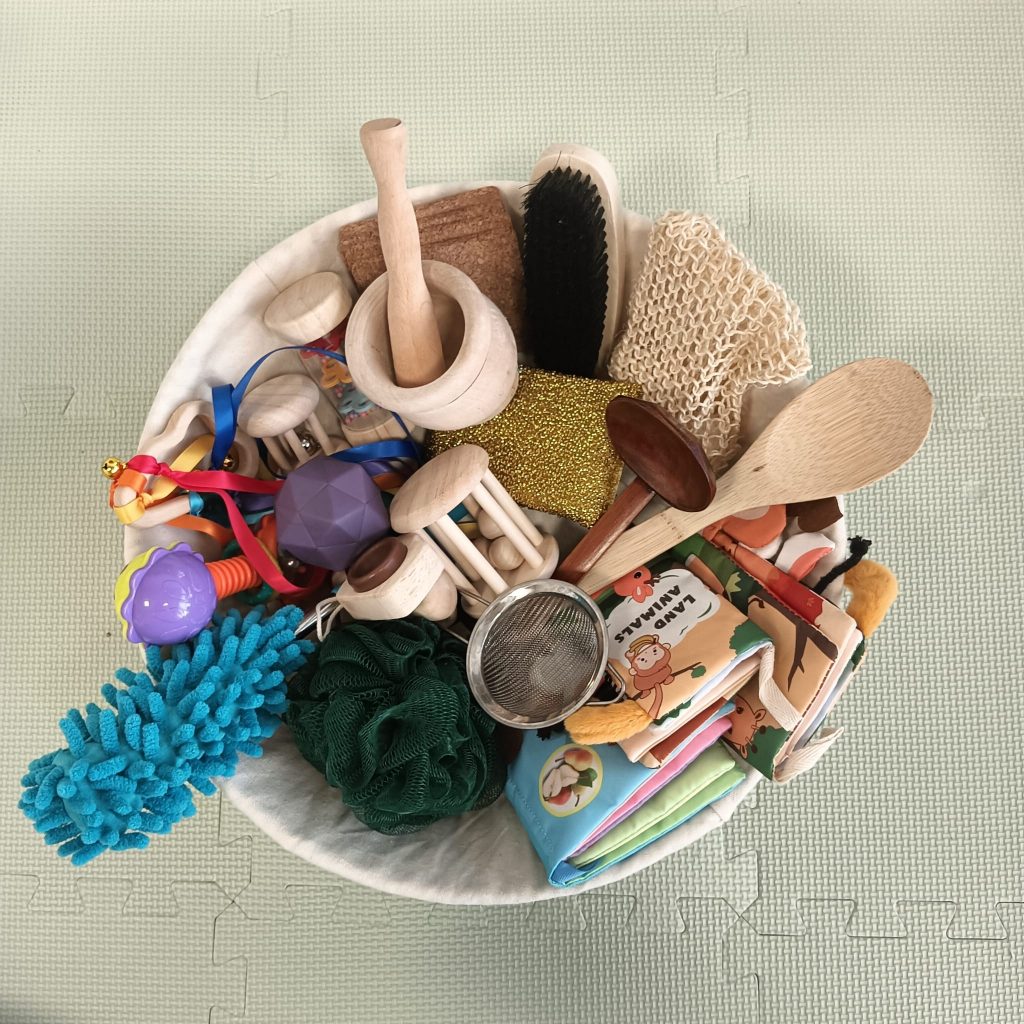 El cesto de los tesoros es un recurso imprescindible para bebés entre los 6 y 12 meses donde se le brinda la posibilidad de explorar de forma libre con diferentes elementos heurísticos (cotidianos, sencillos, sin una finalidad en sí mismos).