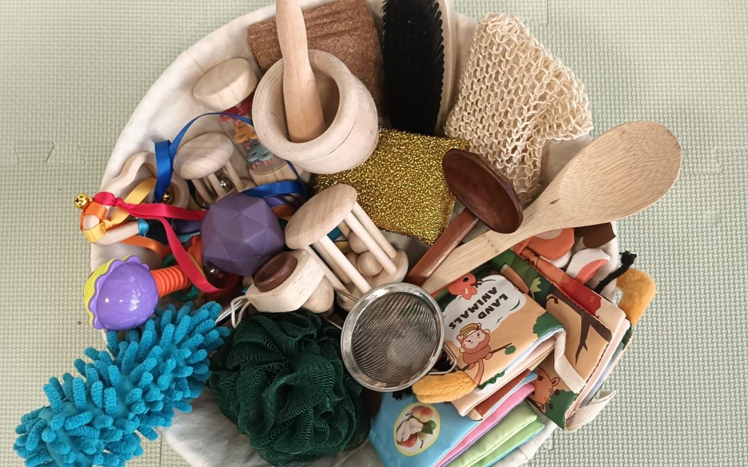 Objetos de uso cotidiano, no plásticos ni juguetes convencionales, que sean seguros para el bebé. Se incluyen elementos naturales y de diferentes texturas, pesos, formas y tamaños. Ejemplos: